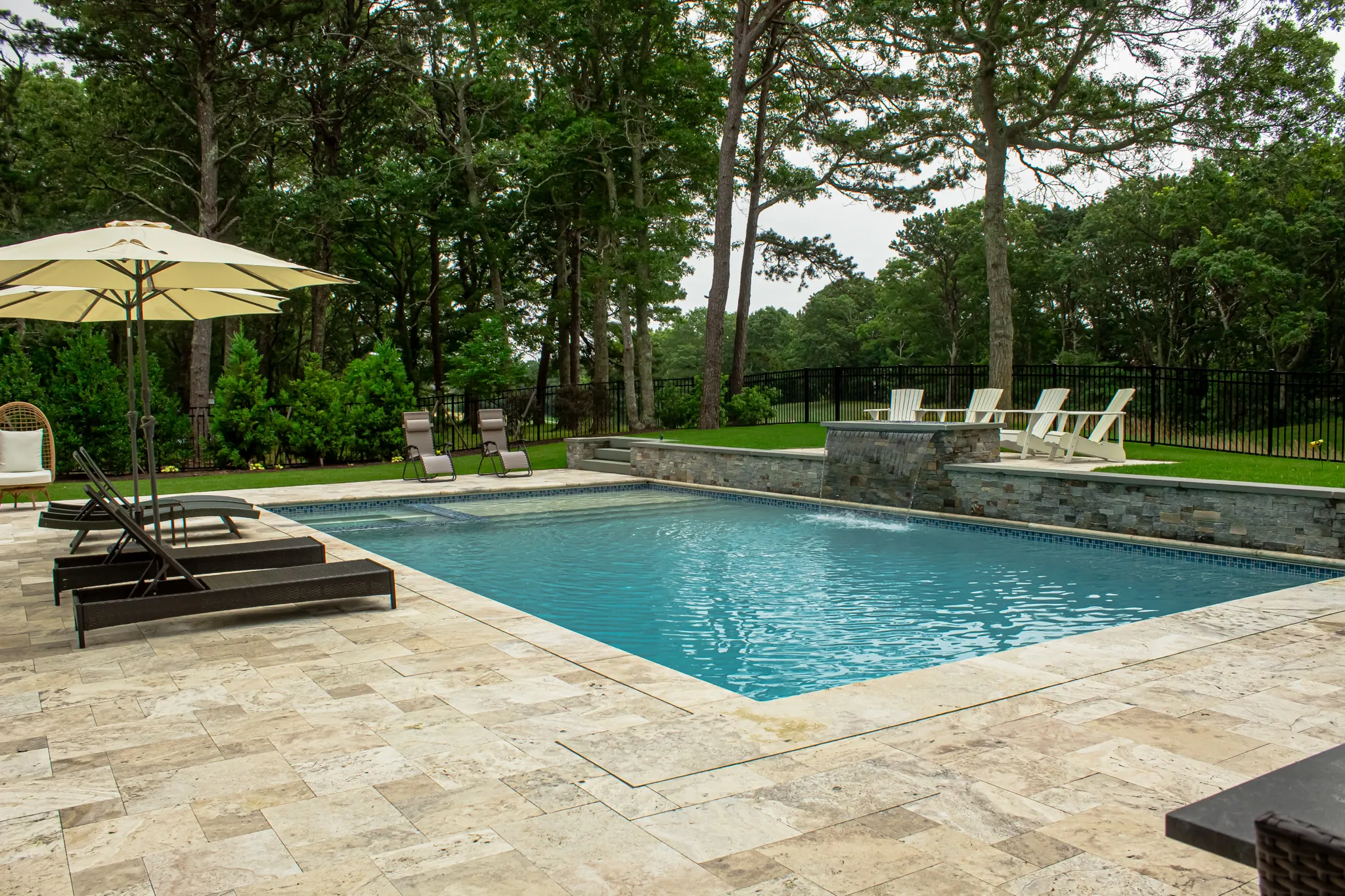 Another major challenge was technical: the pool’s automatic cover required a mechanical vault. Standard installations demand the vault be set back several feet from the pool edge, which would have disrupted the clean, formal lines of the design and consumed valuable space. Our team developed a unique solution by integrating the vault directly into the retaining wall abutting the pool. This allowed us to conceal the mechanical system seamlessly within the structure, preserving aesthetics while ensuring reliable functionality.