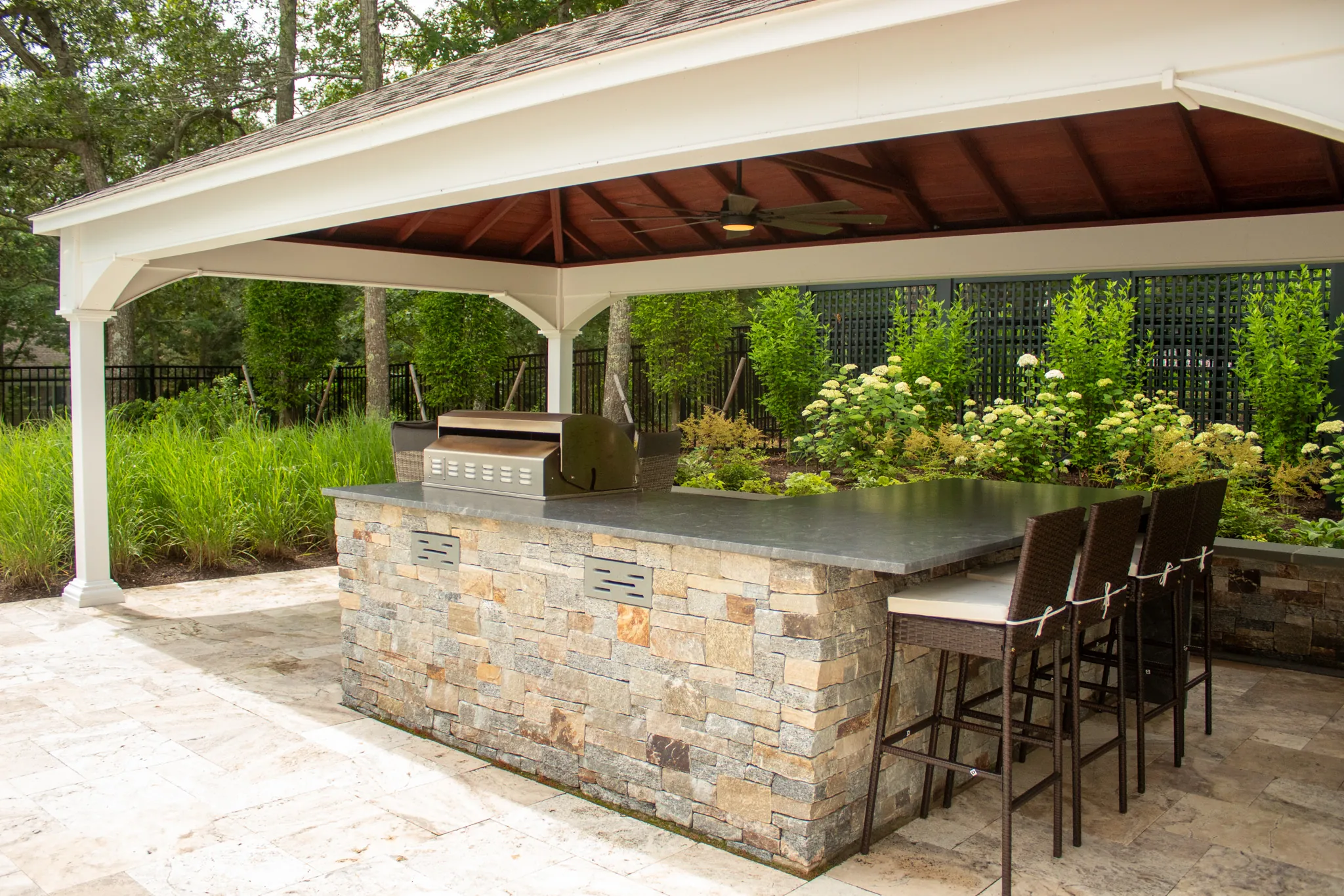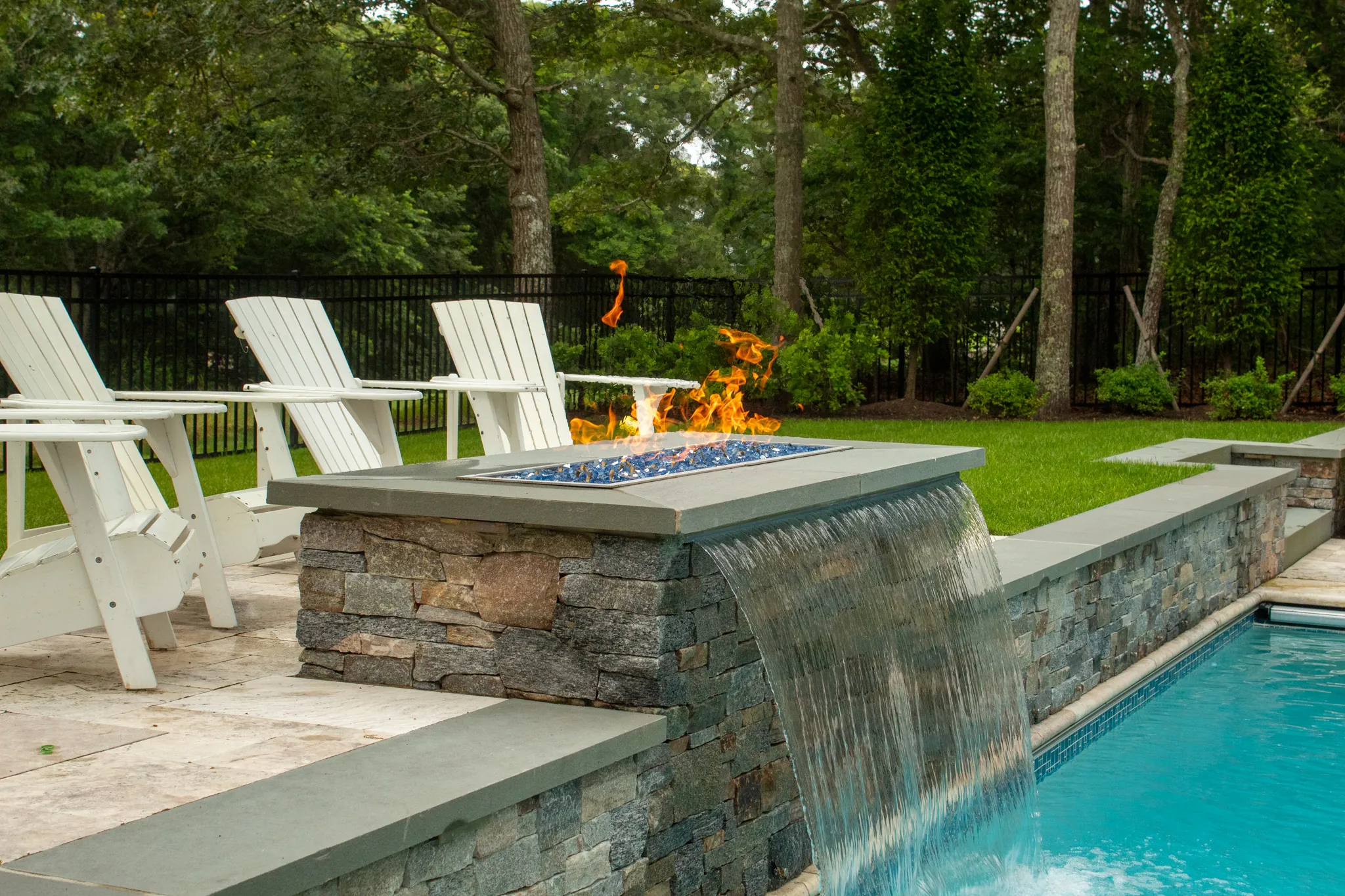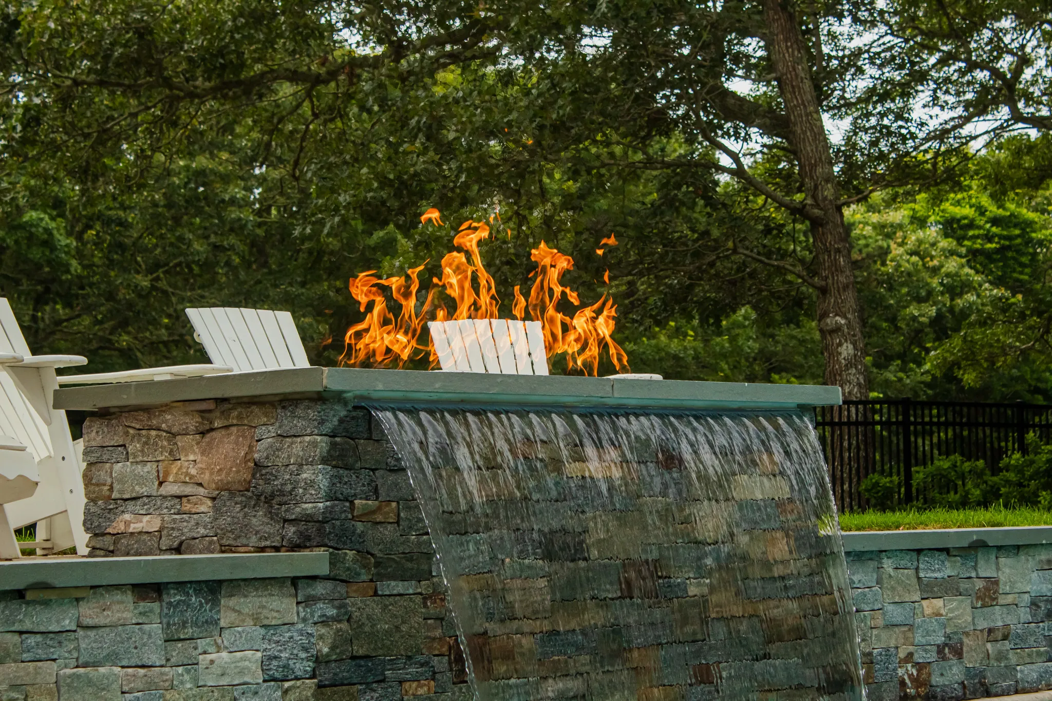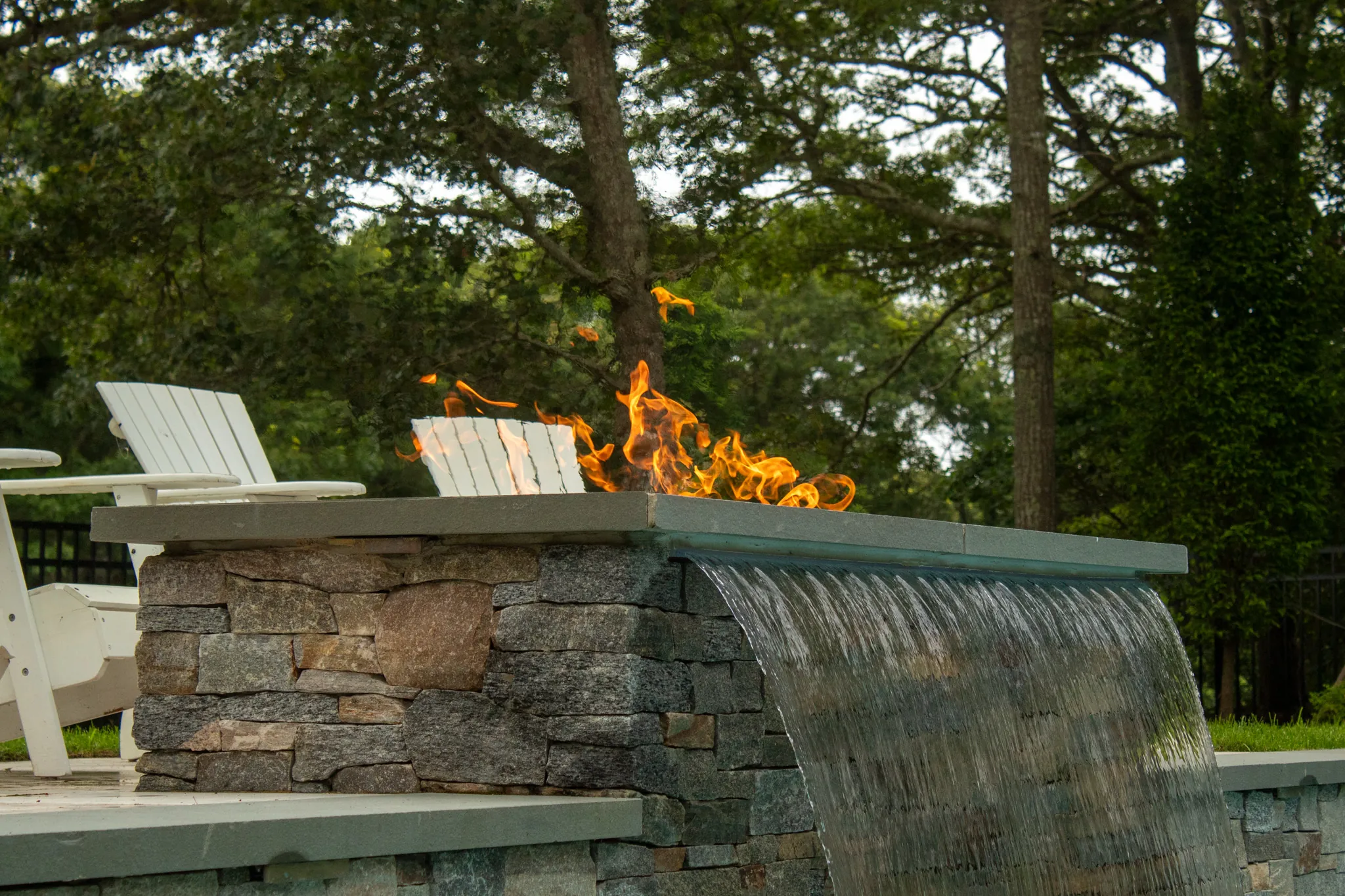 Landscape lighting extends use into the evening, highlighting textures of stone walls, plant masses, and the dramatic fire/water feature. The outdoor kitchen under the pavilion was designed with durable materials, including natural stone and marine-grade finishes, to withstand the coastal environment.