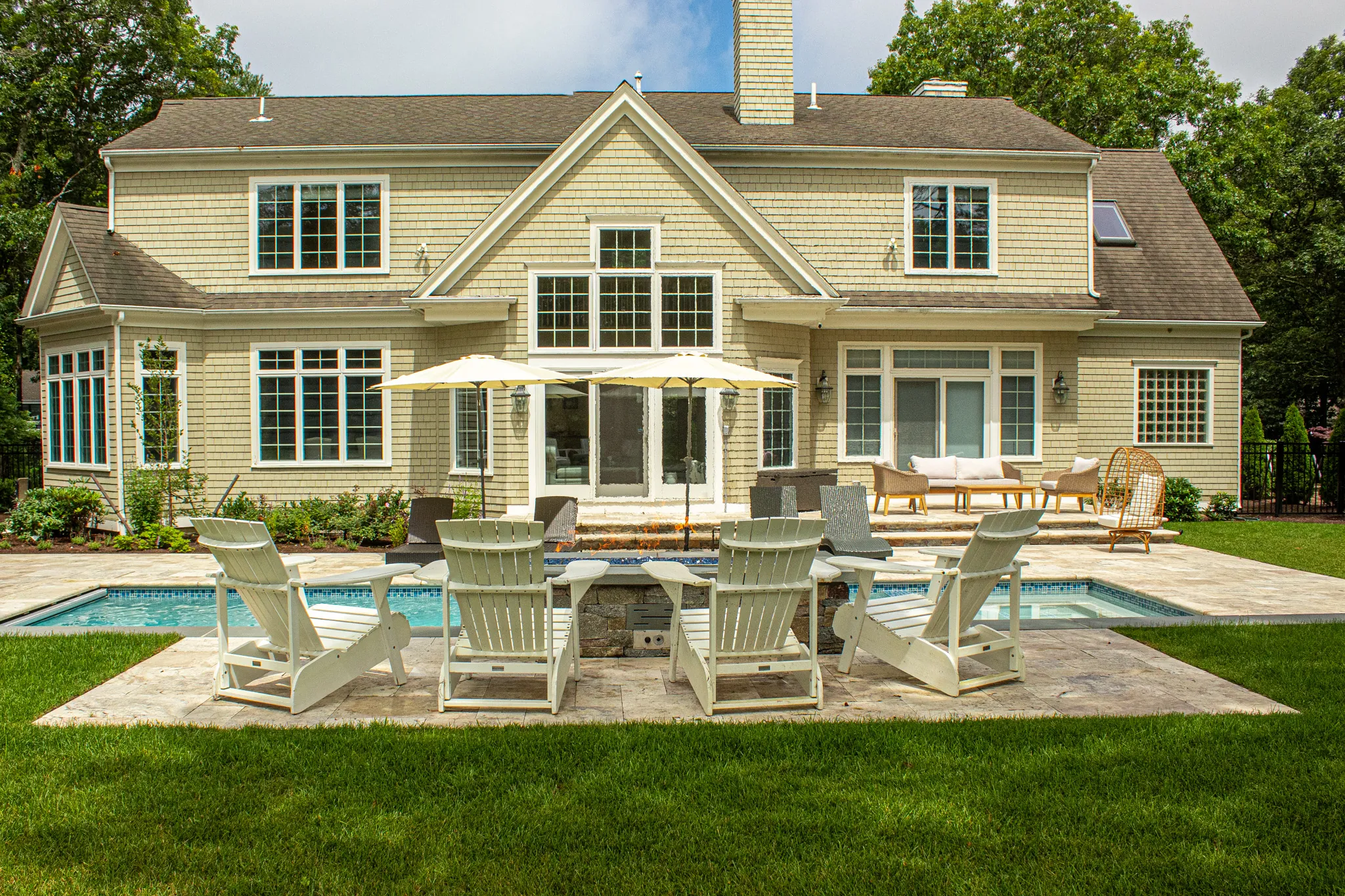Drainage systems were carefully designed to protect both the pool terrace and the golf course, with subsurface systems capturing runoff and directing it safely. Plantings emphasize pollinator-friendly and native species—including bayberry, summersweet, and blueberry—blended with client favorites such as hydrangea and roses.